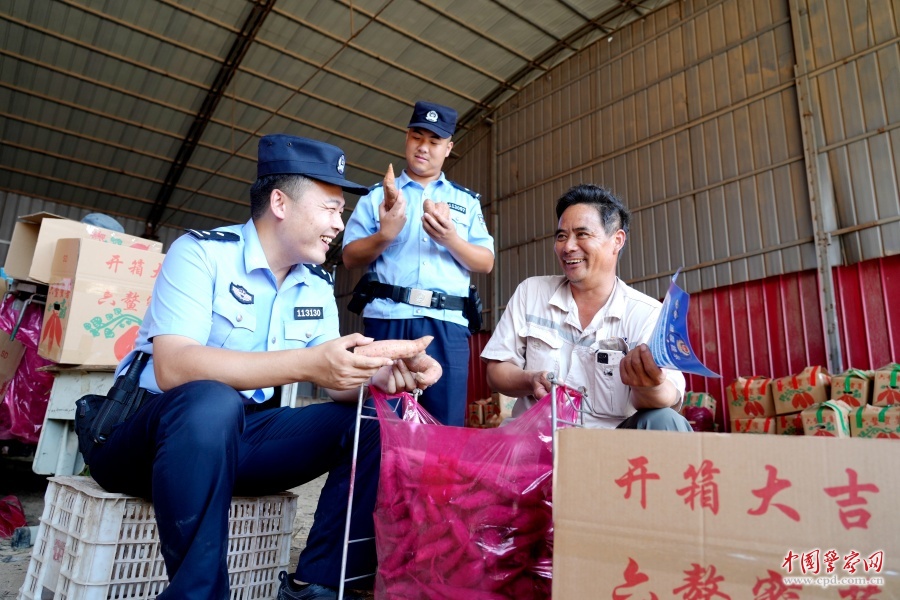 8月26日,河南省开封市祥符区公安局范村派出所民警到辖区红薯收购点,向农户和收购商讲解安全防范知识。高杰 摄