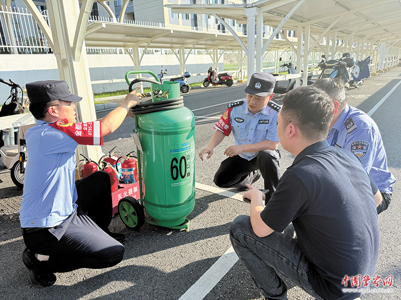 陈欢(左二)在辖区企业指导安保人员正确使用灭火器。刘璇 摄