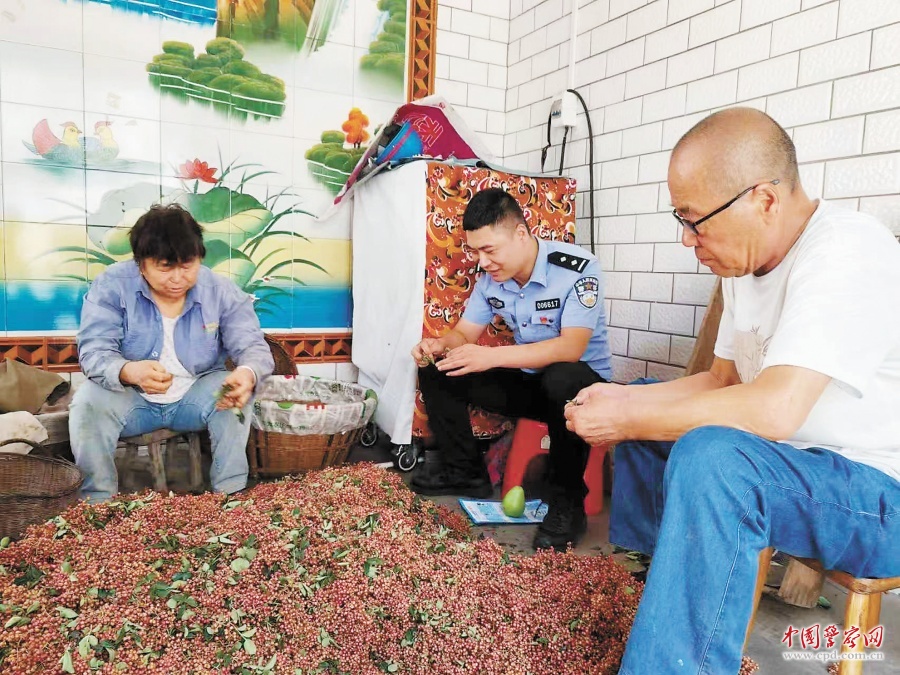 8月18日,陕西省韩城市公安局西庄派出所民警在走访中帮助农民劳作,并向他们宣传反诈常识。薛佩佩 摄