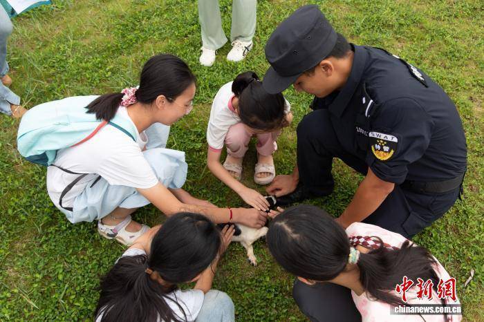 日前,南宁铁路公安局柳州公安处在警犬训练基地举办“萌娃进警营·警犬伴成长”夏令营暨警营开放日活动。活动吸引了80余名家长儿童及30余名“警娃”参与,通过法治教育、警犬演练、萌犬互动等环节,让民众“零距离”感受警营风采,搭建起警民沟通的暖心桥梁。图为民警带领萌娃和幼犬开展互动。胡玄德 摄