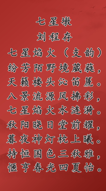 刘程存老师的诗《七星墩》以“七星焰火、水涟漪、秋阳晓日、国色三秋”以及“春光四夏”这一系列富有画面感的描写,展现了自然景色的美丽与时光流转的韵味。整首诗运用了对比与转折,呈现出从四季变化到各类景象的深刻意境,细腻地描绘了一个和谐而美丽的自然世界。