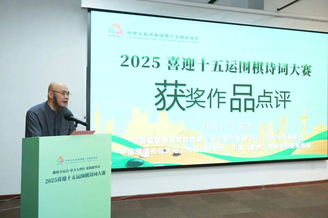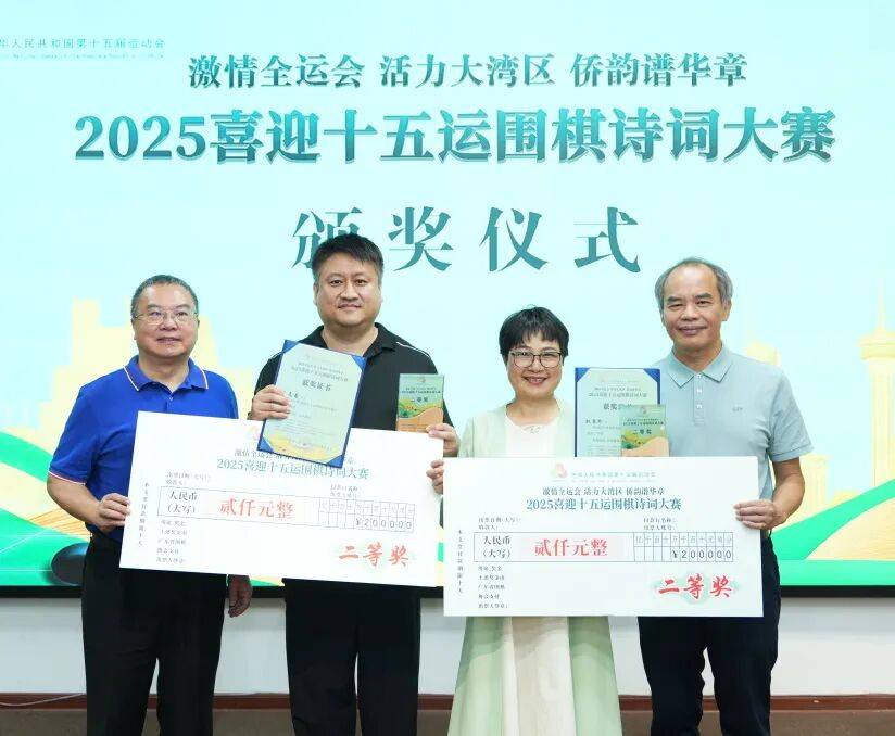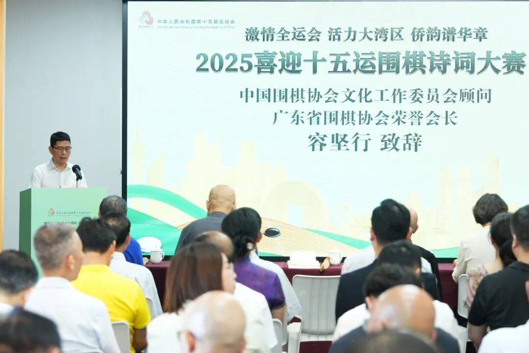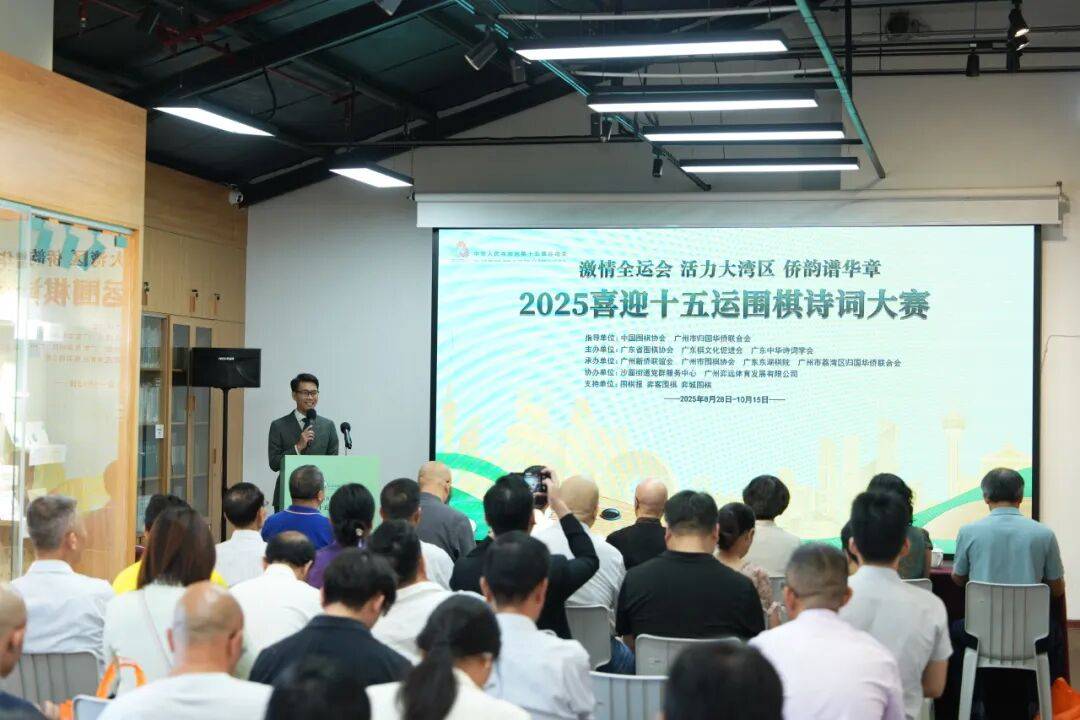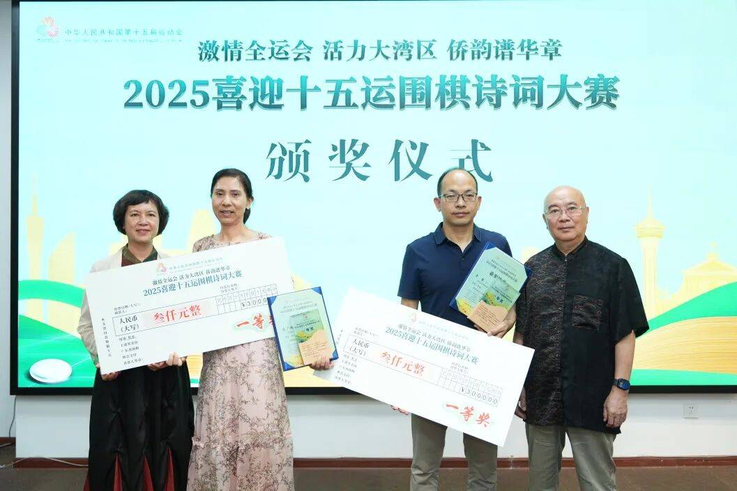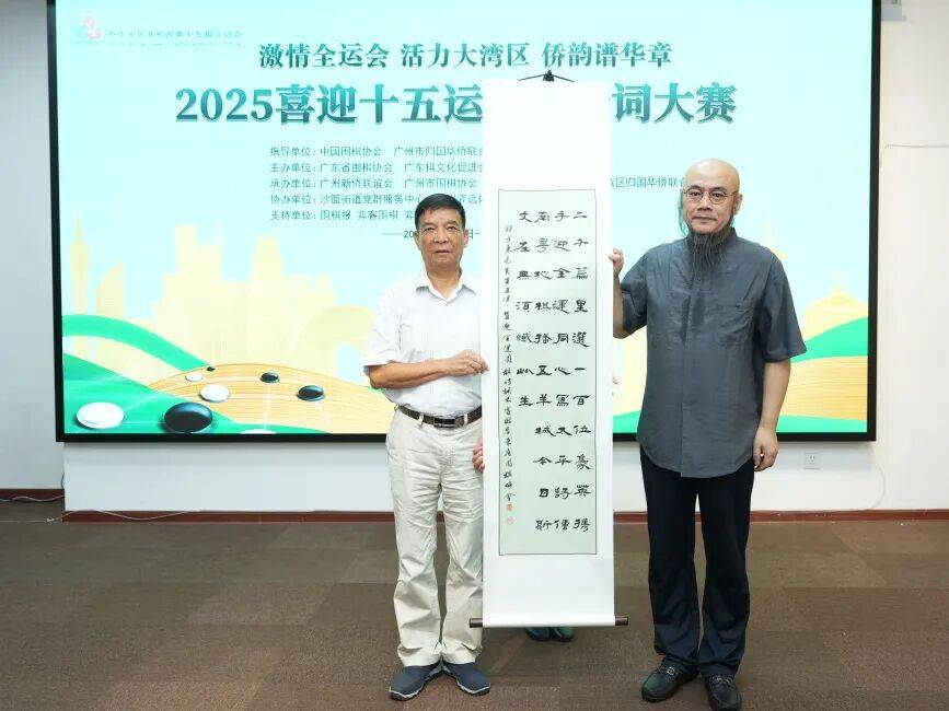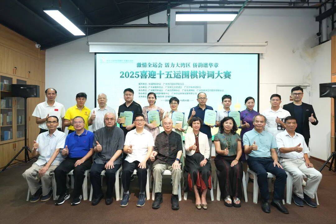 2025年10月15日,“2025喜迎十五运围棋诗词大赛”颁奖典礼在广州文化公园顺利举行。本次大赛以“激情全运会 活力大湾区 侨韵谱华章”为活动主题,由中国围棋协会、广州市归国华侨联合会指导,广东省围棋协会、广东棋文化促进会、广东中华诗词学会主办,广州新侨联谊会、广州市围棋协会、广东东湖棋院、广州市荔湾区归国华侨联合会承办。