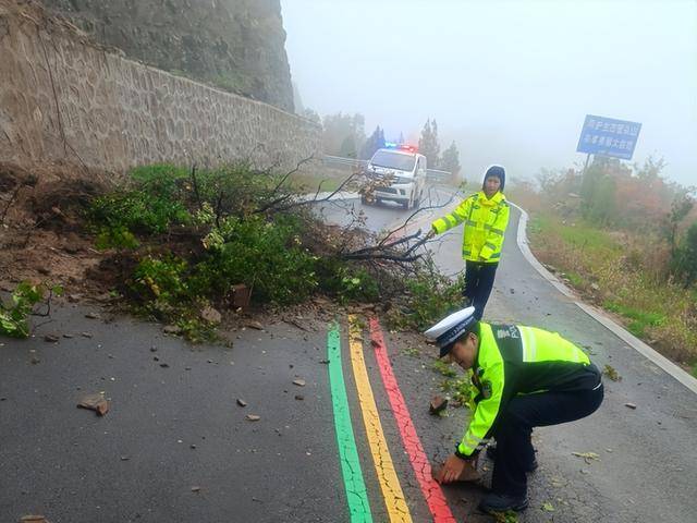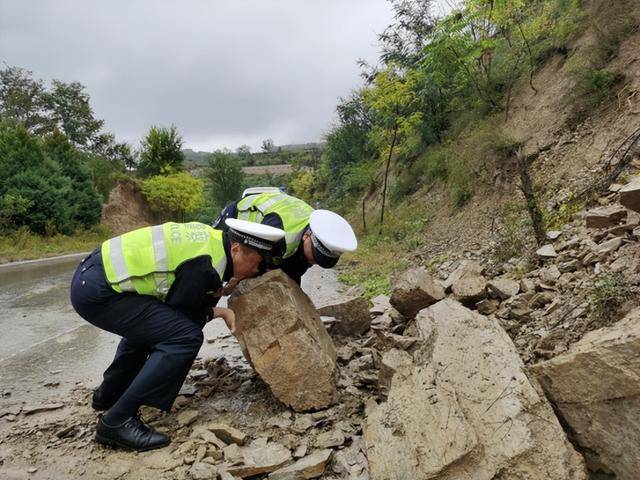 10月5日,降雨导致涧店线3公里处出现落石道路安全隐患,汾西县公安局交管大队民警第一时间赶赴现场,徒手清理落石,引导车辆安全通过。 付大军 摄