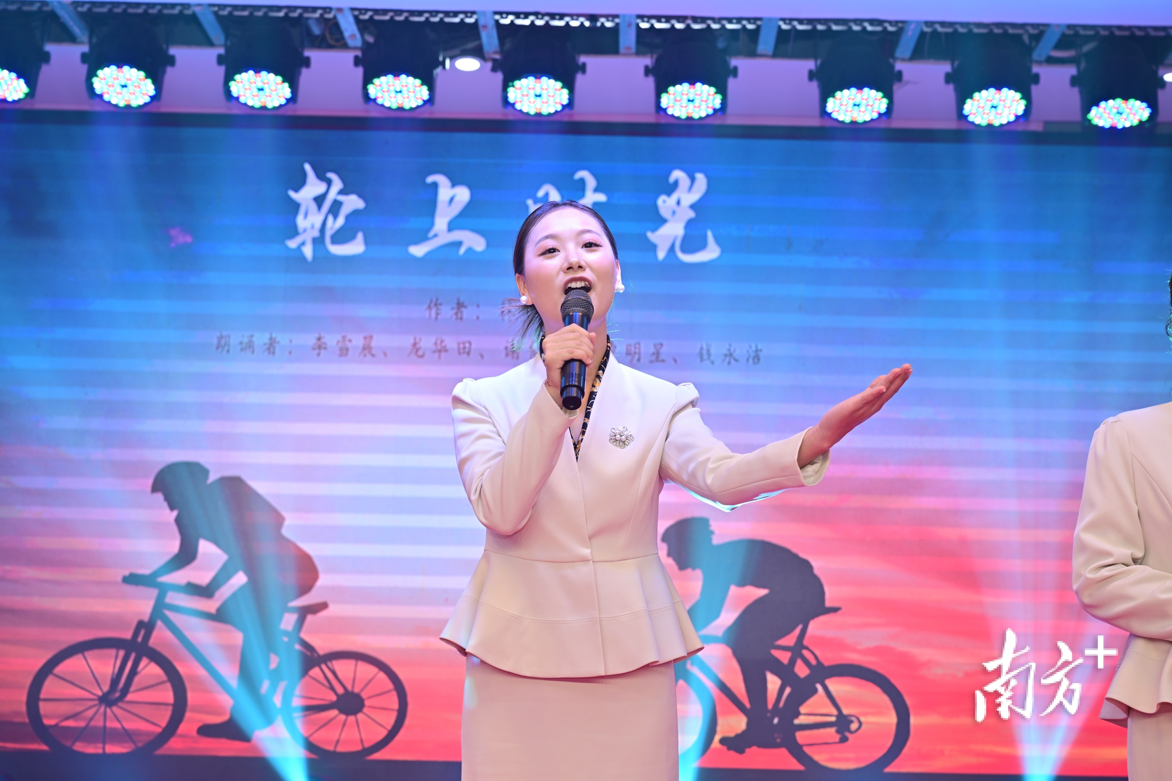 在“骑梦飞扬”主题表演中,彩虹少年们以青春之声激情诵响《飞轮少年》,跃动的诗句如旋转的轮毂,将追风逐梦的少年意气演绎得淋漓尽致;一袭白衣的朗诵者婉转低吟《轮上时光》,用温柔声线吟诵出时光流转的韵律;刘传佐倾情献唱《想家的时候》,浸润了每一位异乡游子的心田。