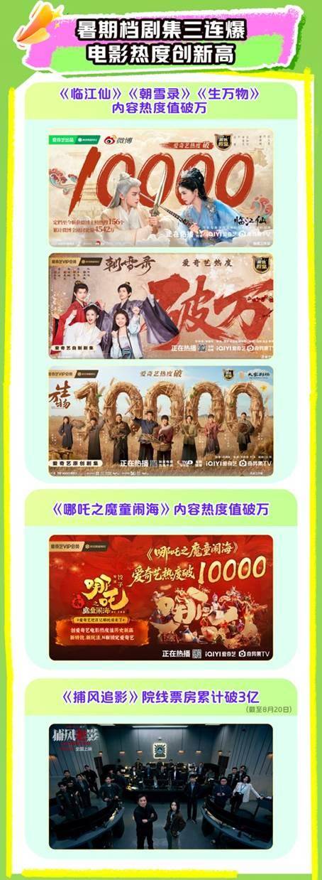 此外,爱奇艺的电影业务也持续火爆。电影《捕风追影》已经突破3亿元票房,预计最终票房将超10亿元。另一部电影《哪吒之魔童闹海》也延续了热度,成为爱奇艺首部内容热度值突破万的电影。